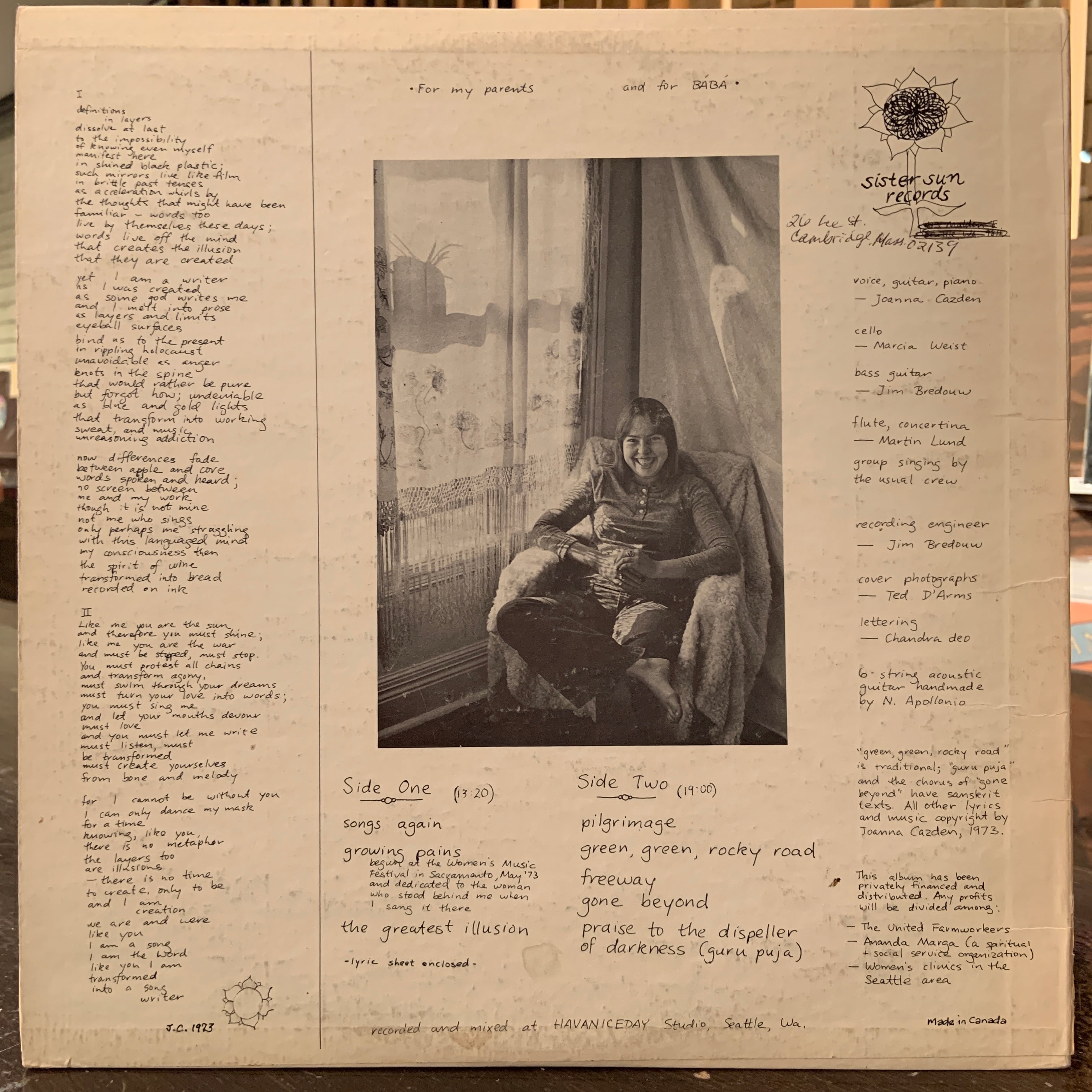 道端に人知れずひっそりと咲く名もない可憐な花の如きカナダ産女性アシッド・フォークのレア・アイテム。ジャケも良いですが、インサートも雰囲気抜群の逸品です。ジャケットは表面スレあります。