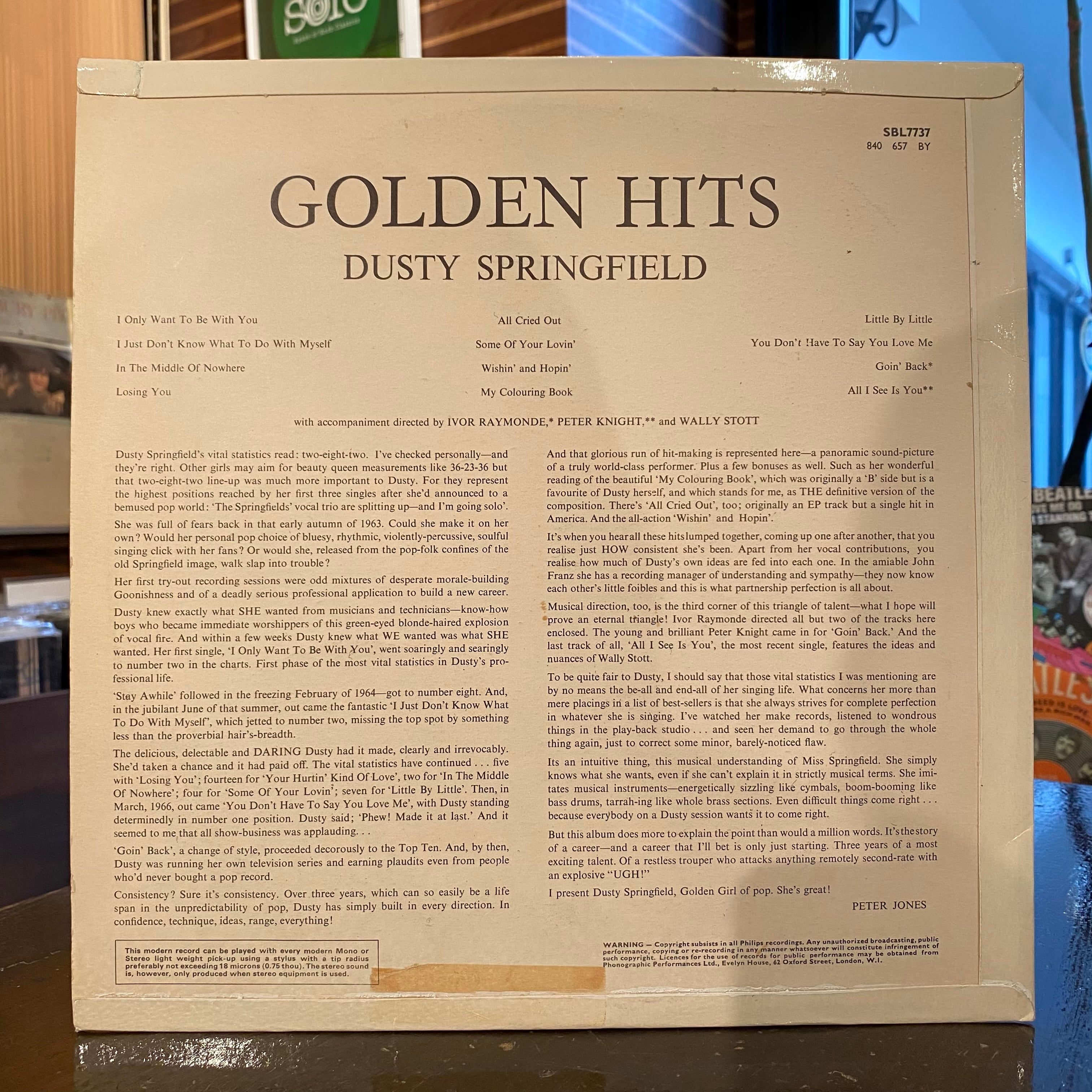 英ポップ・シンガー、ダスティン・スプリングフィールド、66年のベスト盤。UKプレス、コーティング、フリップバックジャケット。裏ジャケに0.8x7.5cmのテープ痕あります。