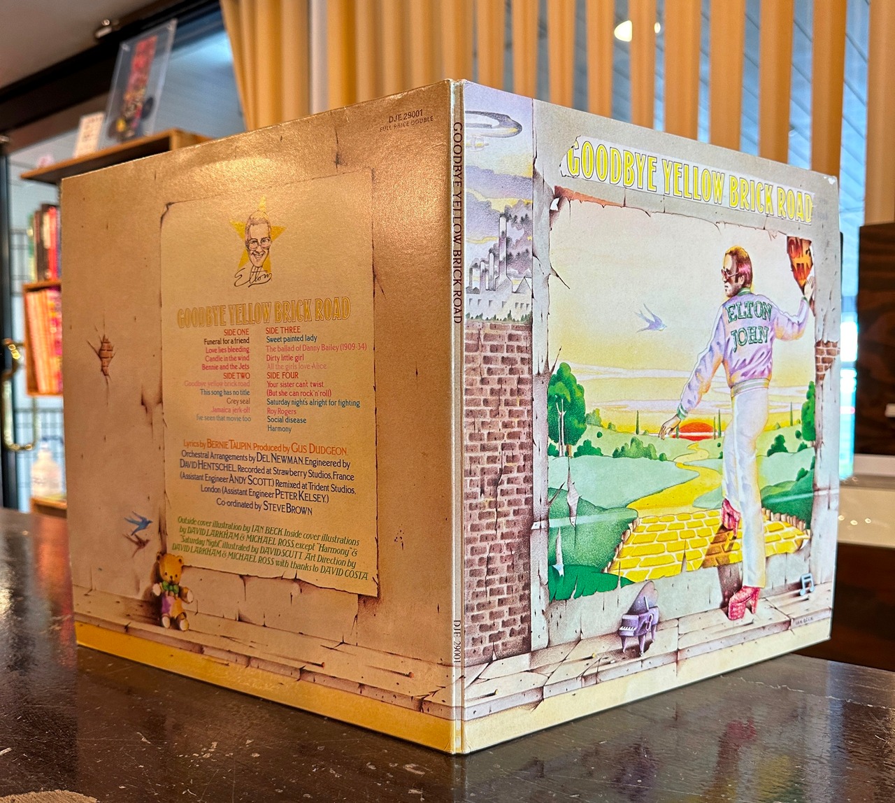 エルトン・ジョンの傑作2枚組。80年代の再発盤。DJMイエロー・ブラックラベル。見開きジャケット、オリジナルインナーバッグ付。表ジャケ右上にごく小さな?れ、薄いスタンプ痕あります。