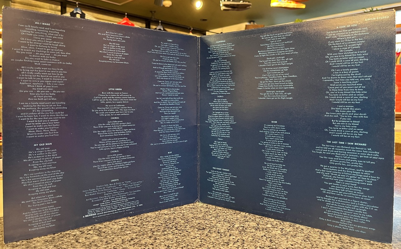ジョニ・ミッチェル名作。UKオリジナル、見開きテクスチャード・ジャケット、マト2/1。レーベルにA面に小さなシールはがれ。
